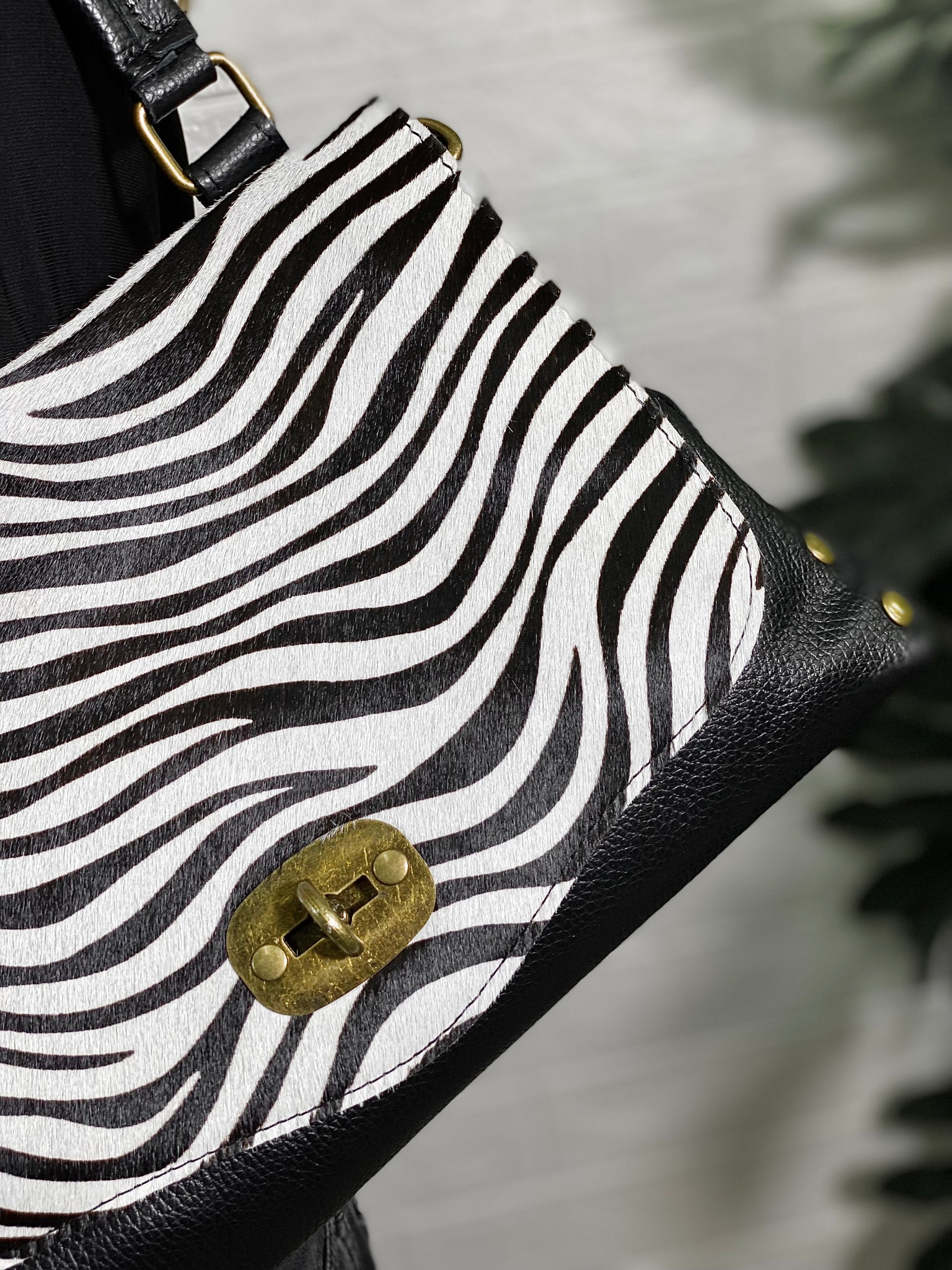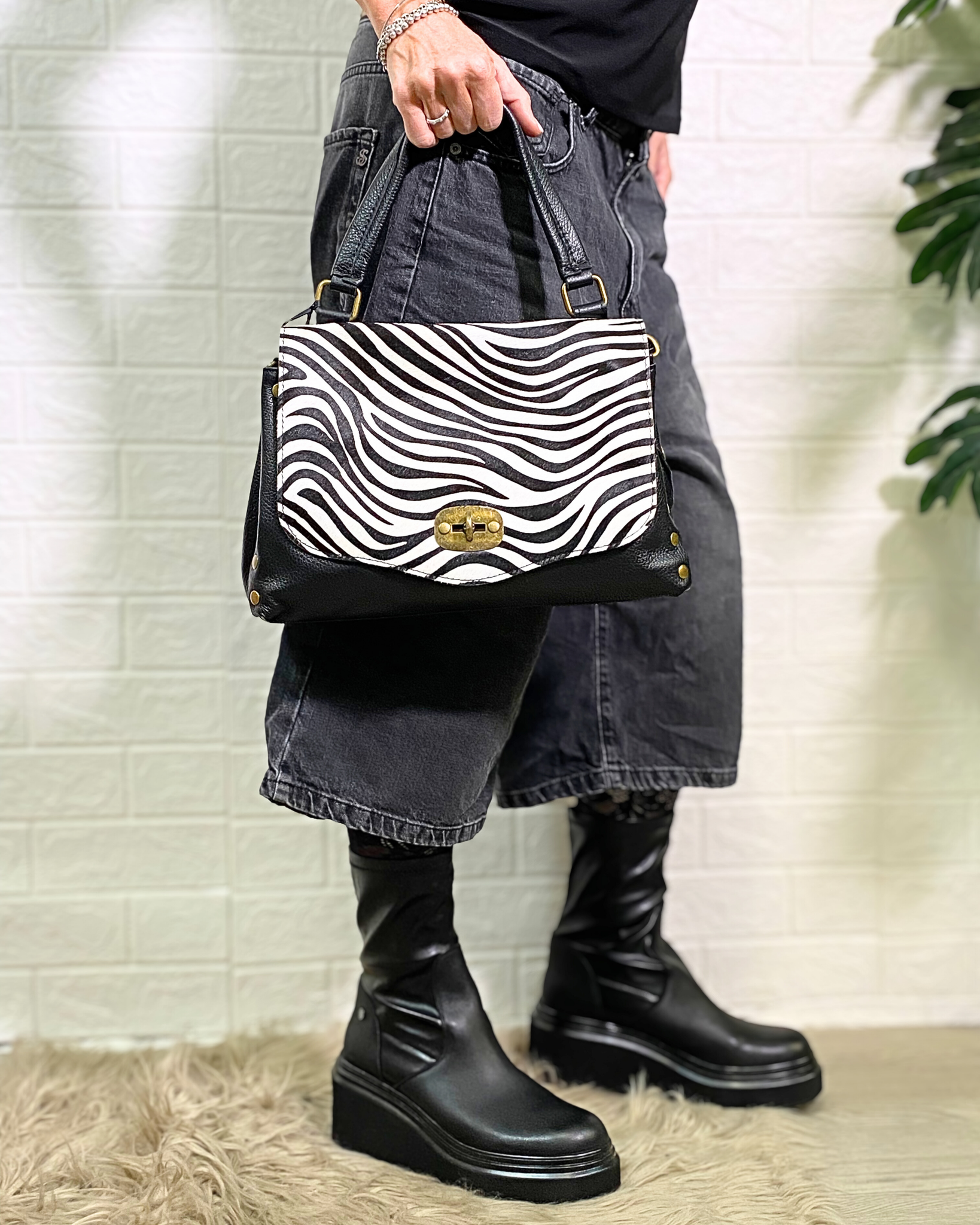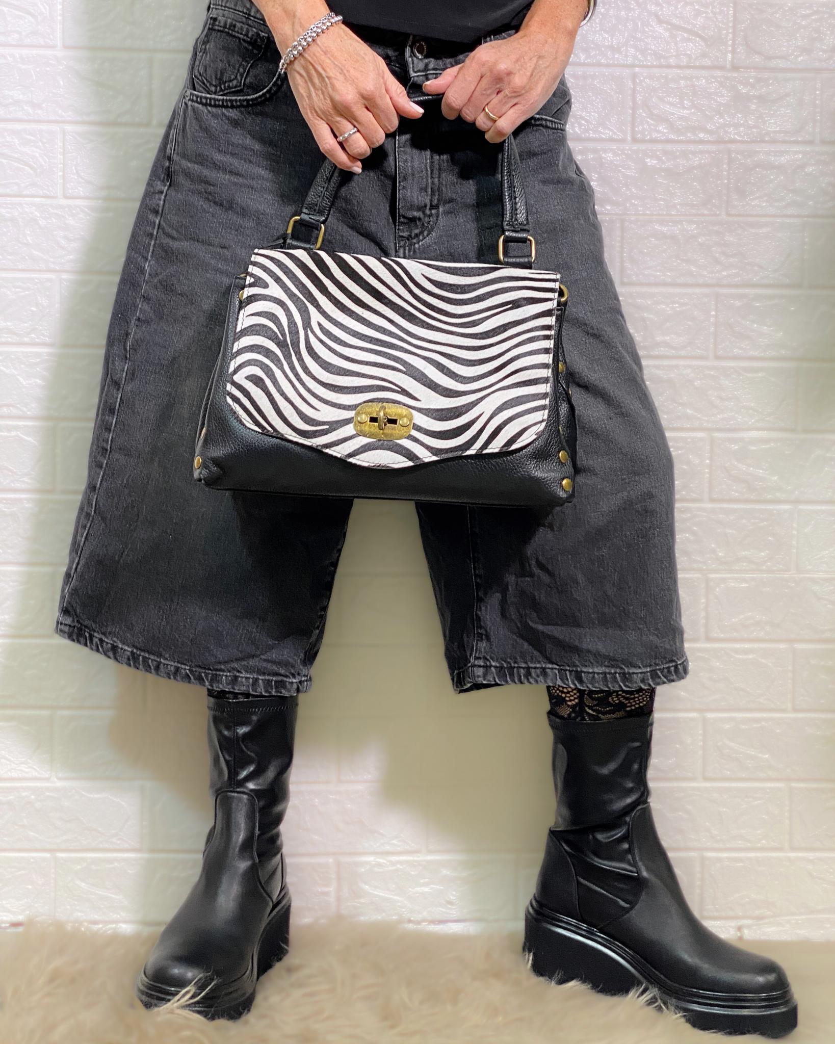 Borsa in pelle, spaziosa e versatile, perfetta sia per uso quotidiano che professionale. La patta in cavallino zebrato, gli scomparti ben organizzati e un design casual chic la rendono una borsa che si adatta ad ogni occasione. La lavorazione è artigianale made in Italy e gli accessori sono metallici color peltro invecchiato. Lo scomparto è unico con 1 tasca interna con zip e 2 porta oggetti aperte. L’interno è foderato in tessuto in tinta, la chiusura è con lampo ed è presente una tracolla aggiuntiva regolabile. Misure cm. 31X25X10