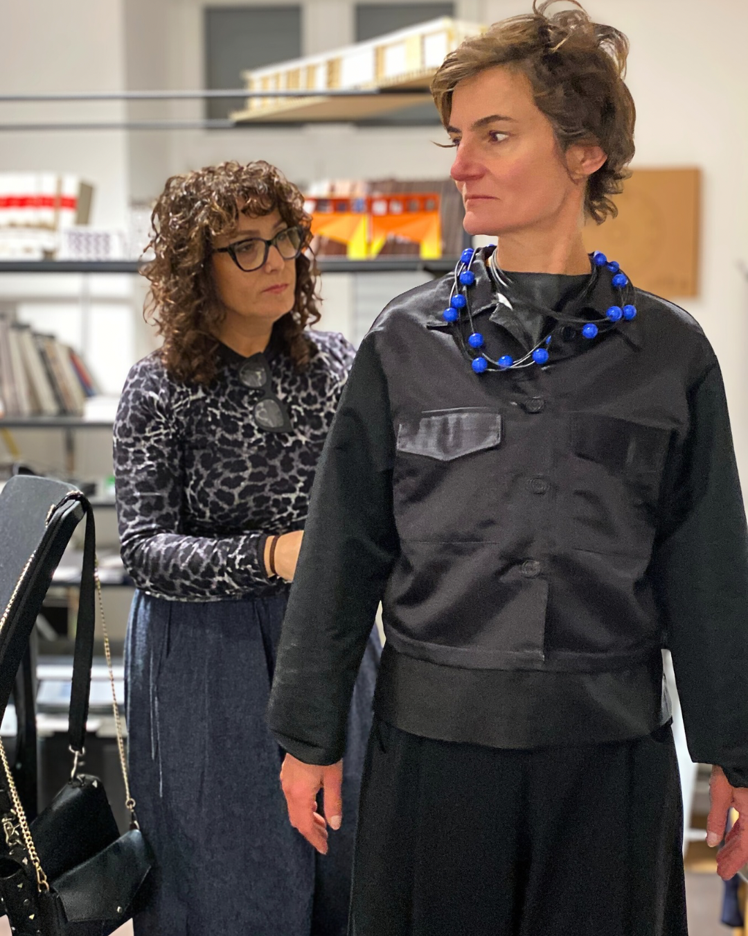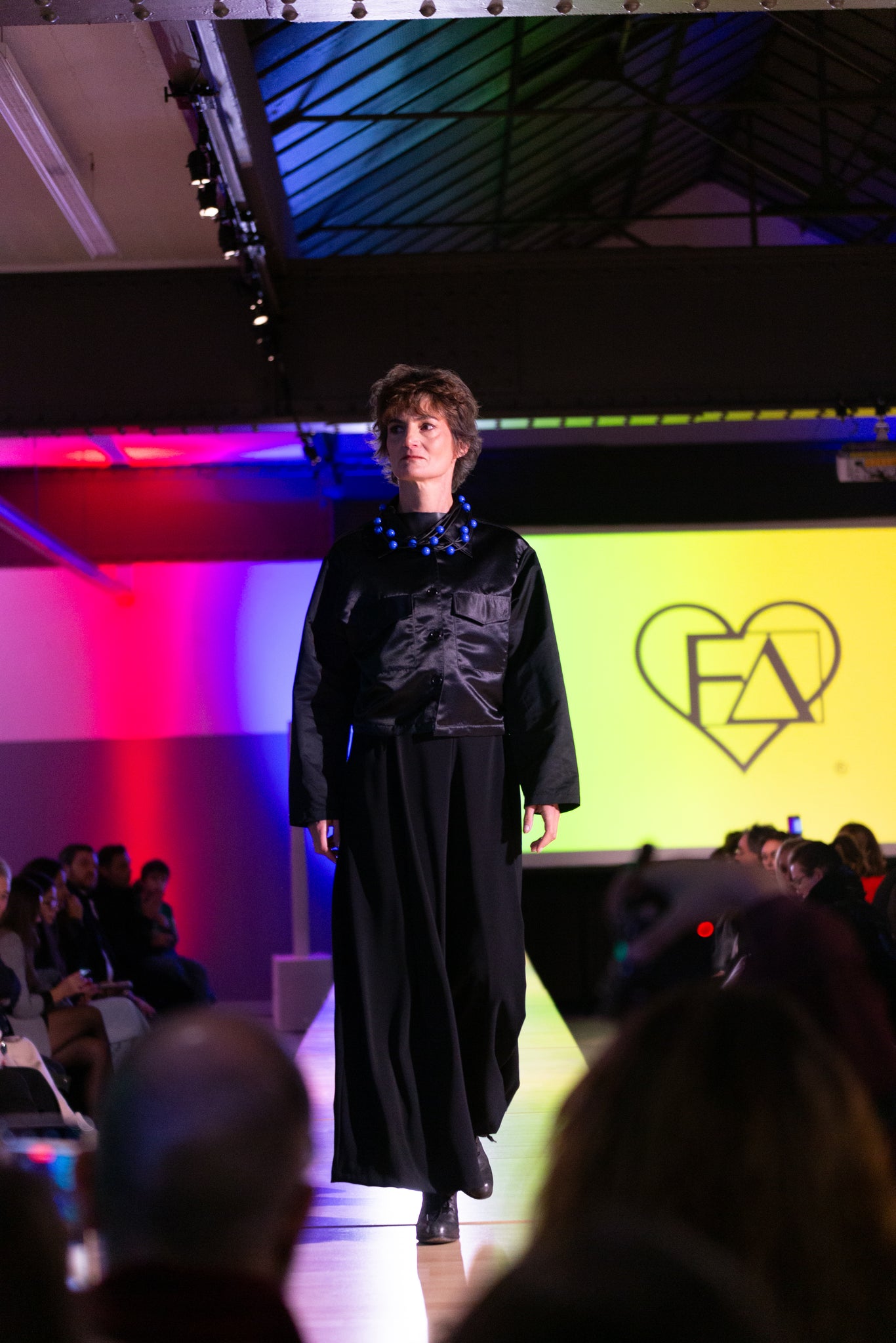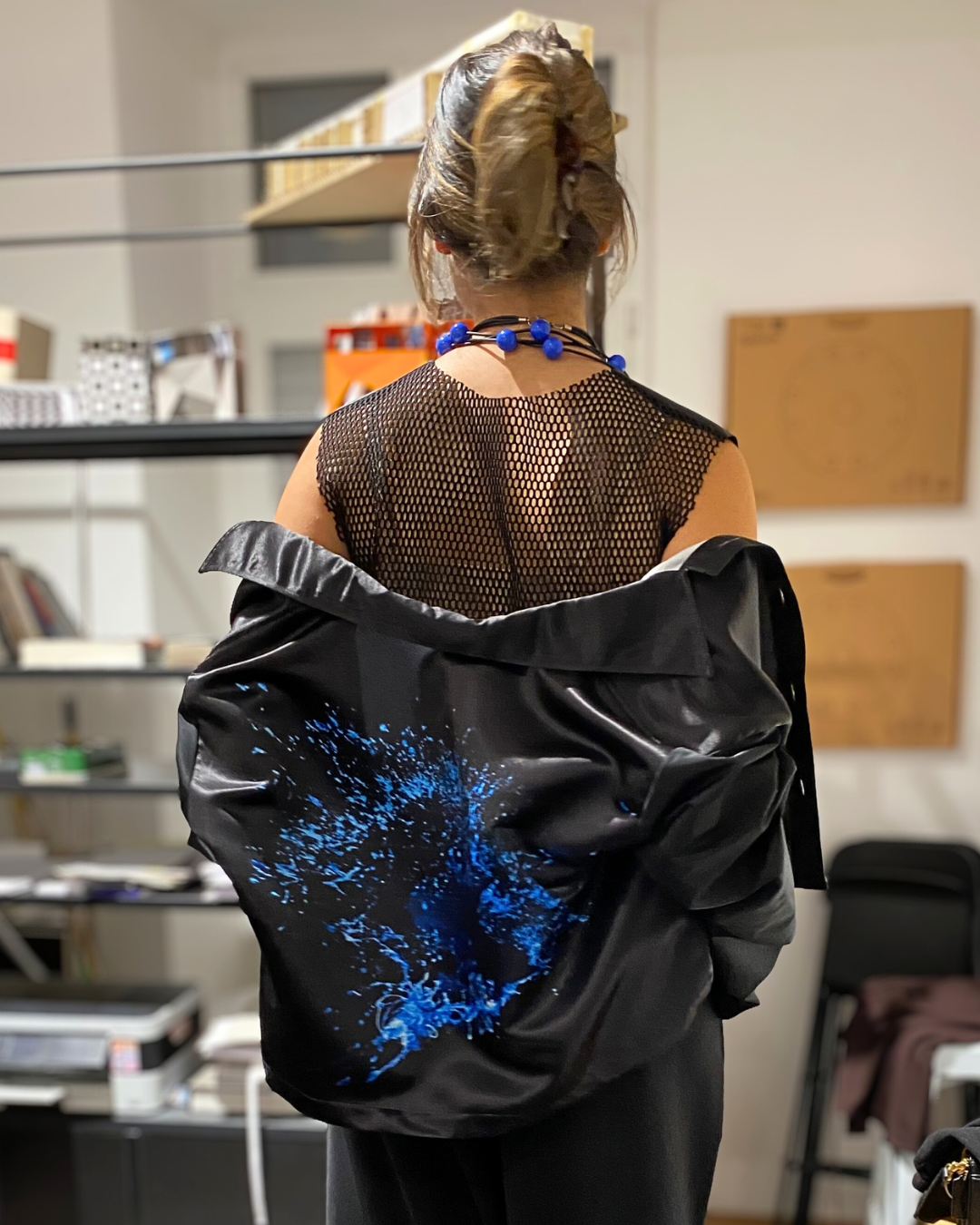 L’ undicesimo outfit che ha debuttato sulla passerella all’Italian Creativity On The Run Way a Ginevra è composto da: giacca Sara (199€) in tessuto duchesse con stampa personalizzata realizzata a partire da un disegno originale dell’artista Armando Pelliccioni, smanicato ecopelle e rete (89€) e pantalone Susi (139€) in tessuto cadì.