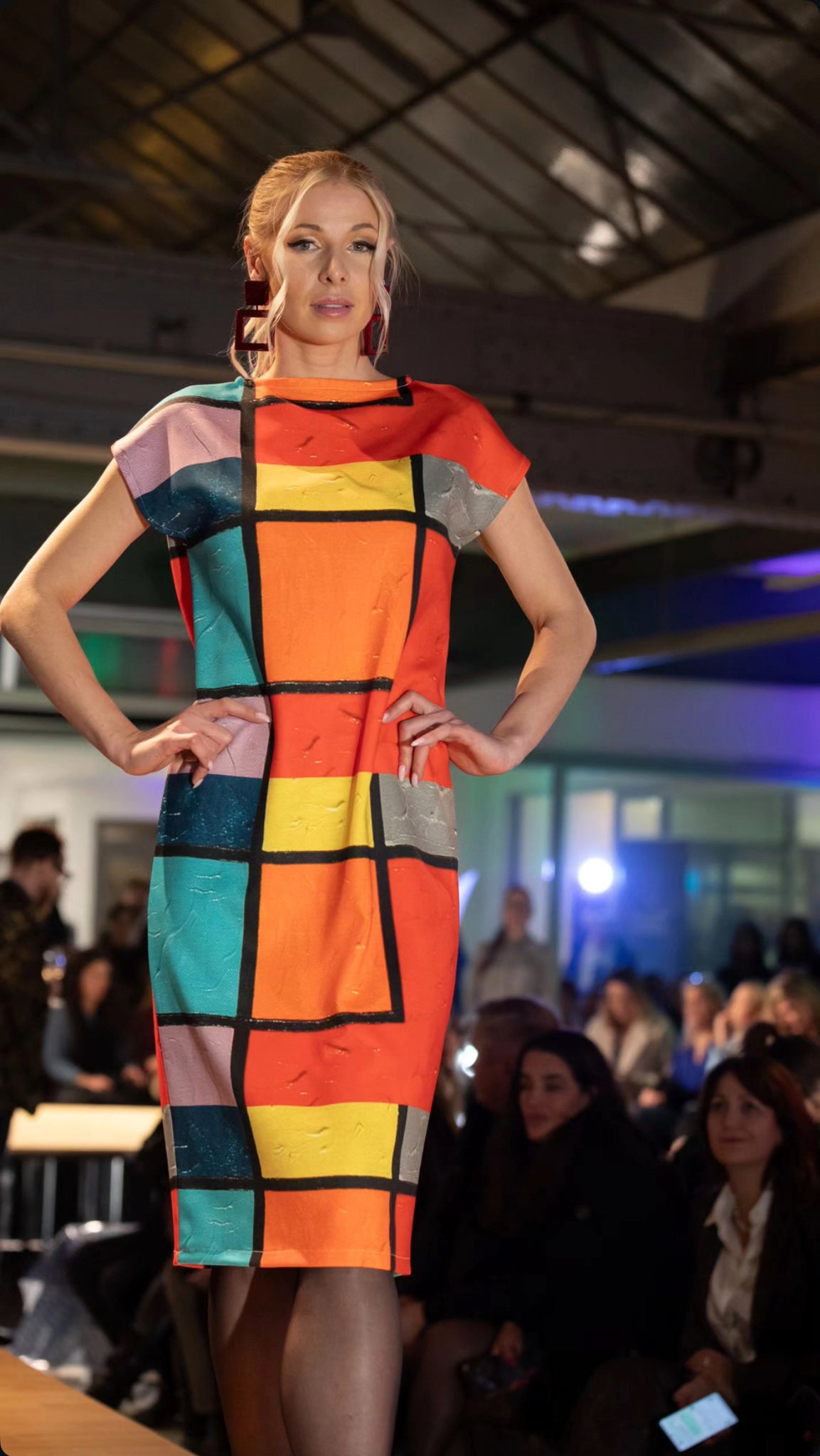 Il dodicesimo outfit che ha debuttato sulla passerella all’Italian Creativity On The Run Way a Ginevra è composto da: abito Kyoto (199€) in tessuto double jersey con stampa personalizzata realizzata a partire da un disegno originale ispirato all’artista Mondrian.