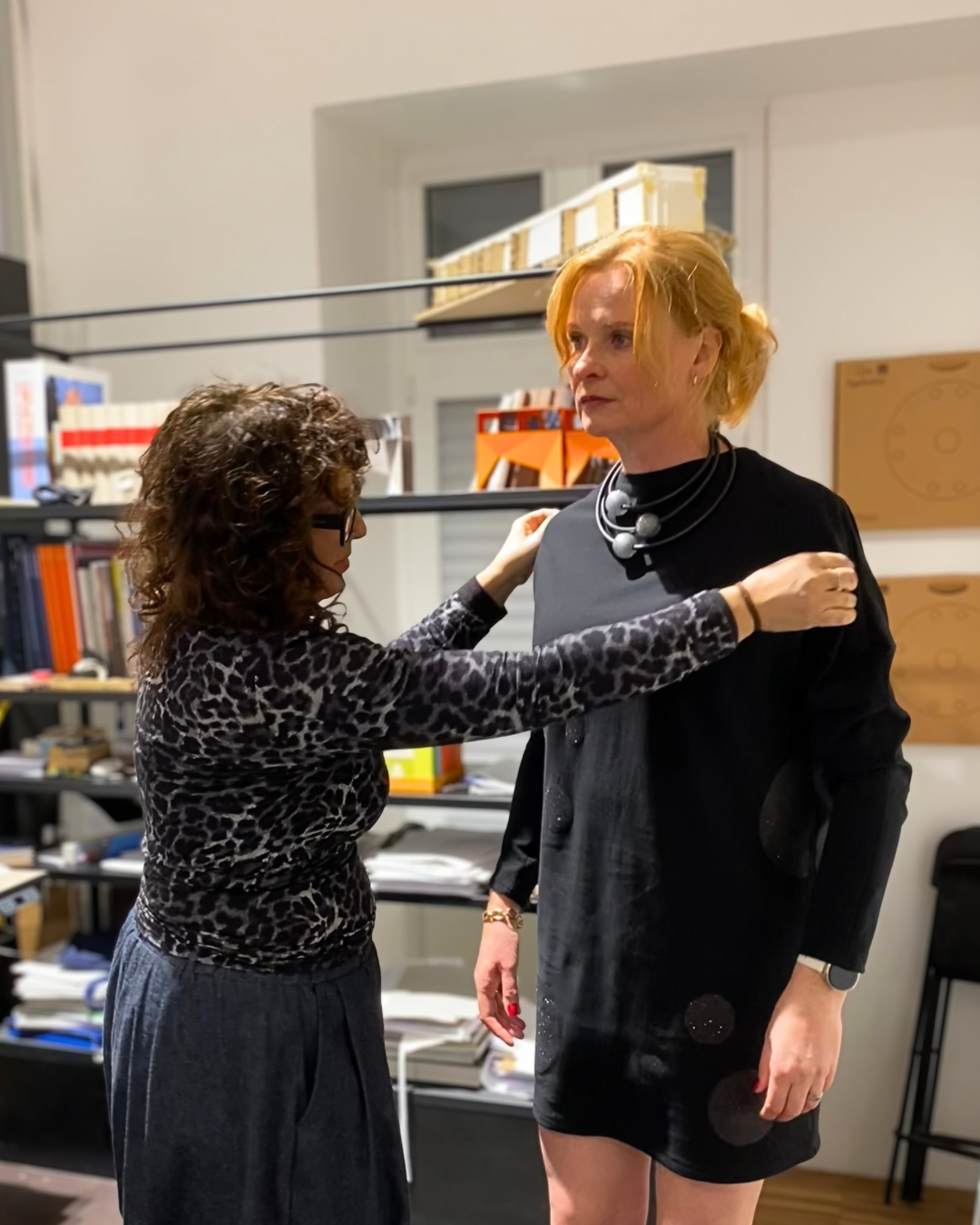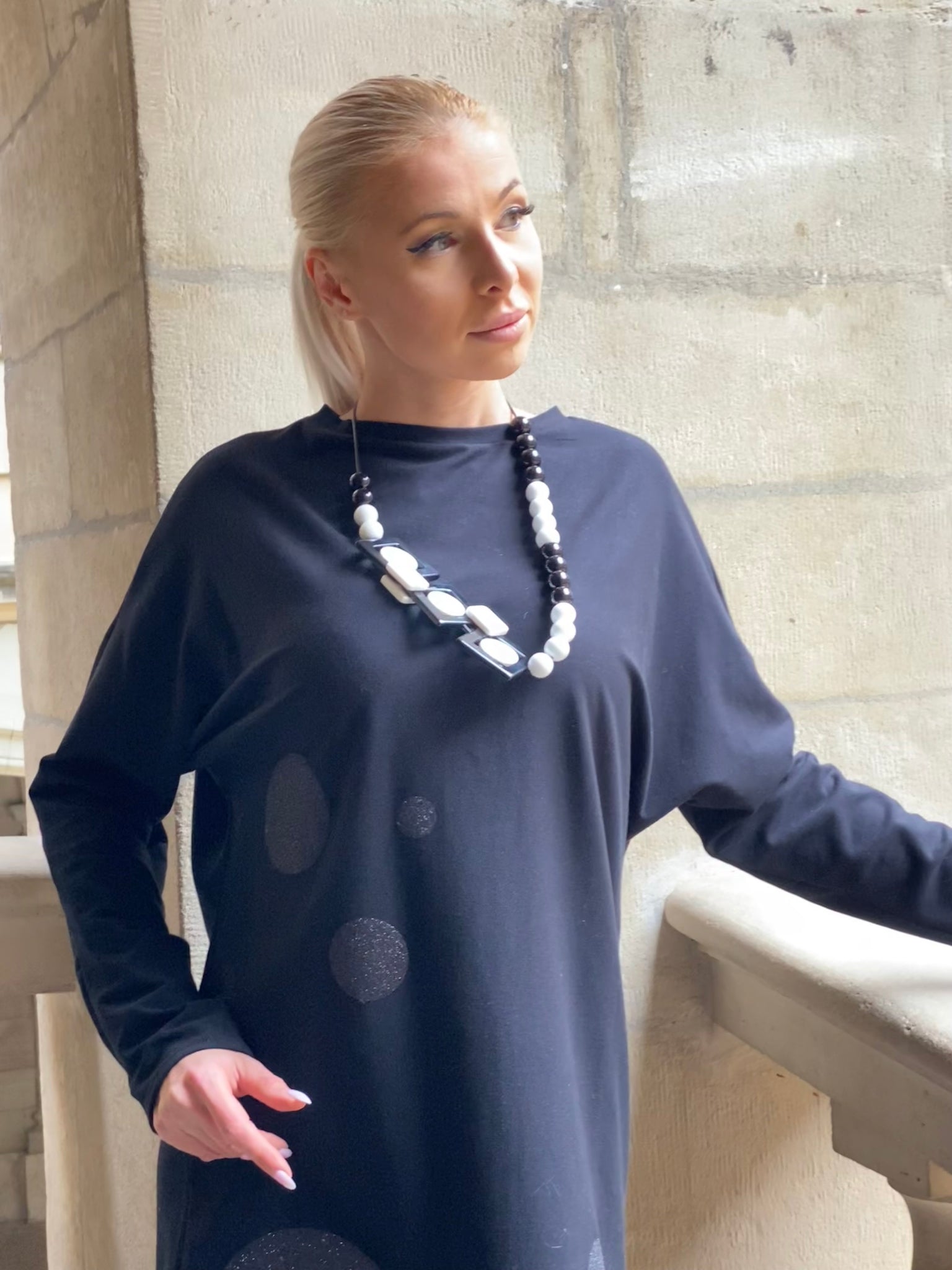 Il terzo outfit che ha debuttato sulla passerella all’Italian Creativity On The Run Way a Ginevra è composto da: Abito Ginevra, modello inedito presentato in questa occasione. Abito ampio sulle spalle, con manica pipistrello. La linea morbida, avvolge e si restringe verso il fianco, per creare una silouetthe femminile, ma comoda. Modello casual chic. La misura è unica con una taglia consigliata fino alla 46/48, è possibile la confezione su misura: contattaci!