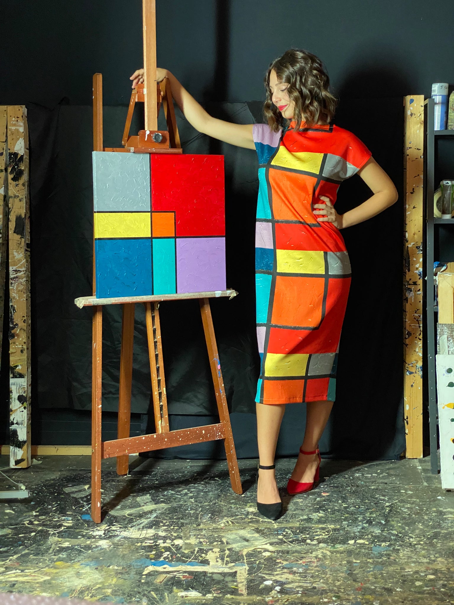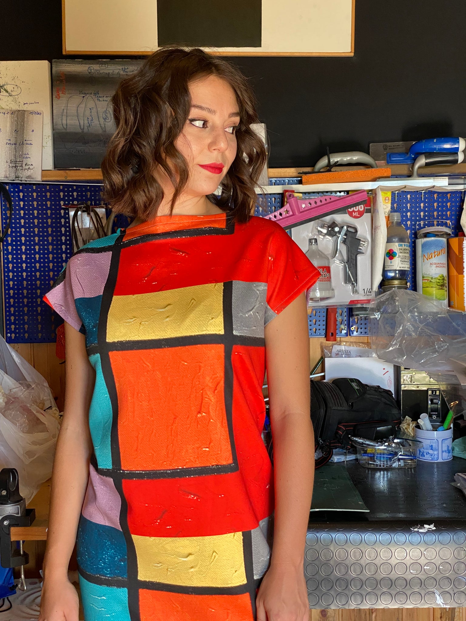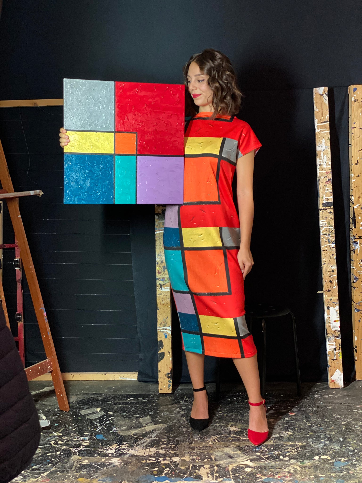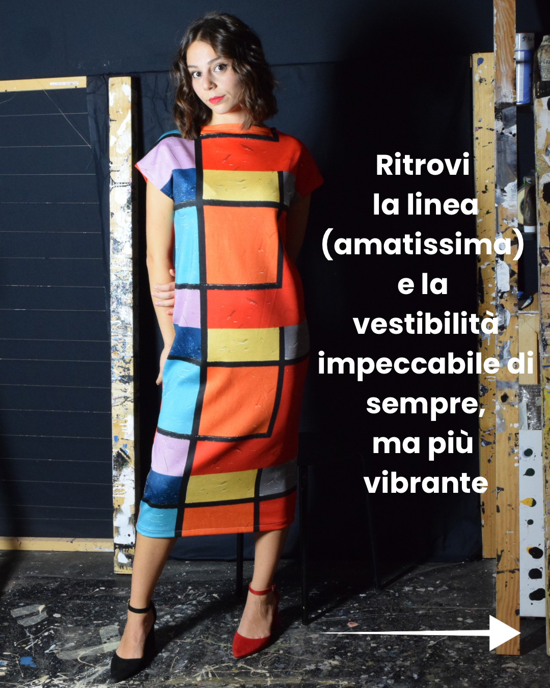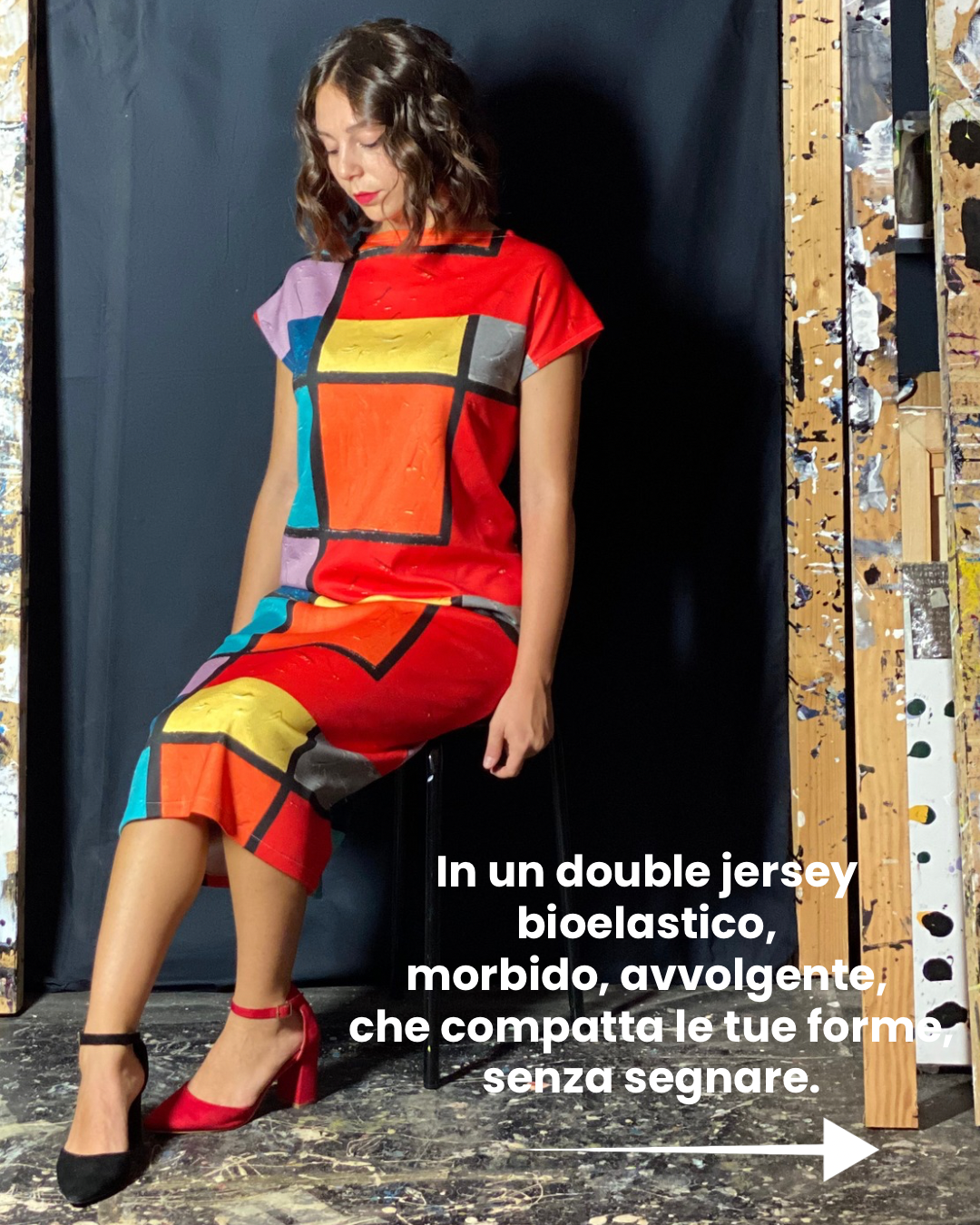 Kyoto è l’abito a tubino di linea molto femminile e super amato! La sua caratteristica è il taglio sartoriale impeccabile e strategico, che esalta la silouette, senza sagomare troppo la vita, e soprattutto l’addome: sceglilo se vuoi indossare un capo minimal, particolare, ma anche comodo. La lunghezza è midi. Taglia unica consigliata fino alla 46/48. Questa edizione limitata è realizzata in double jersey in un tessuto esclusivo realizzato in occasione della mostra Scienza Indossata, in  collaborazione con l’artista Armando Pelliccioni: la mini collezione si rifà alle sue opere in stile Mondrian. Contattaci con whatsapp al numero 3393511144 per qualsiasi domanda, e se volessi un Kyoto su misura, possiamo realizzarlo per te! Il capo che riceverai, ove terminato in pronta consegna, viene realizzato su ordinazione, per garantirti un prodotto unico e di alta qualità. Grazie a questa scelta, contribuiamo a ridurre gli sprechi e la produzione eccessiva.Ci impegniamo a completare il tuo ordine in 20-25 giorni lavorativi. Ti ringraziamo per la pazienza!