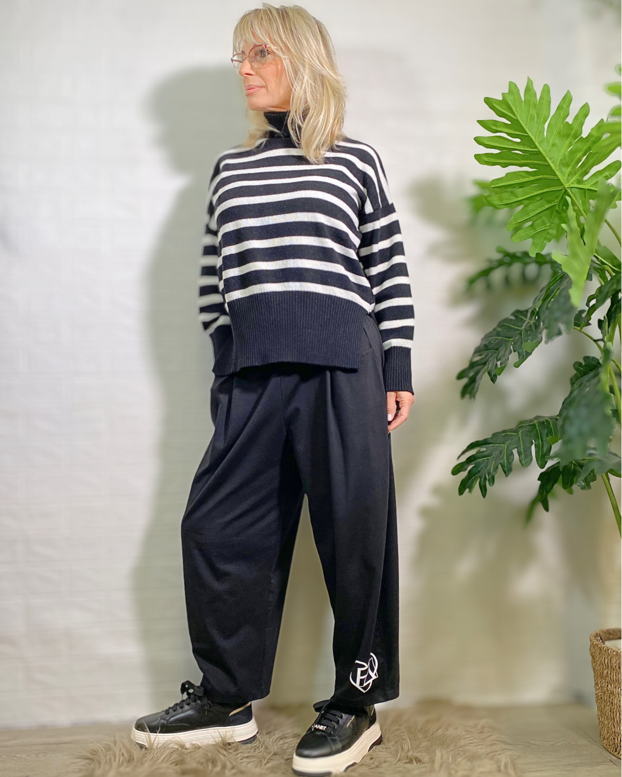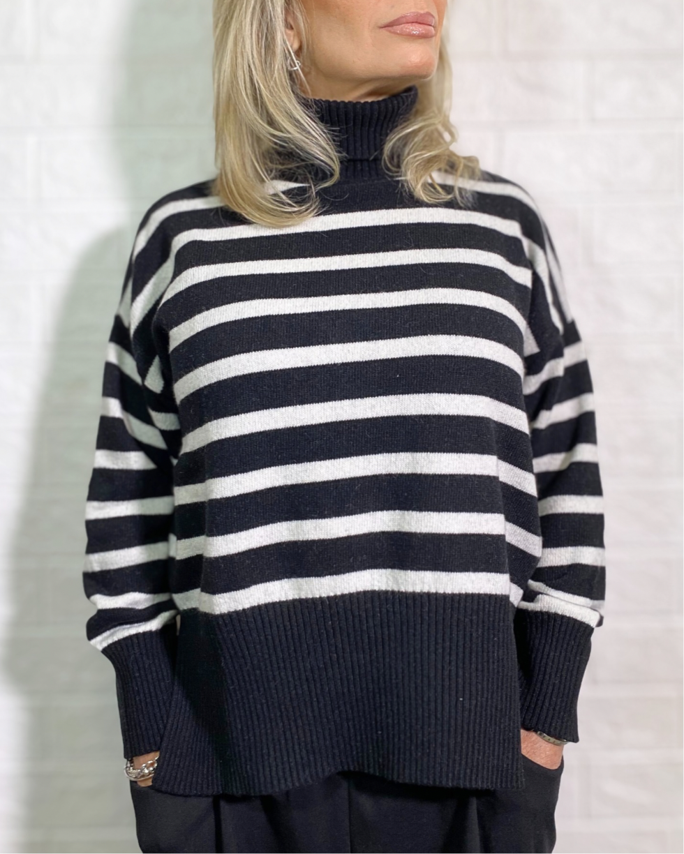 Maglione a collo alto confortevole e caldo. Realizzato in misto lana merino, cachemire e viscosa, presenta dei comodi spacchetti ai fianchi per una vestibilità super comoda. Il filato è super morbido ed è adatto anche alle pelli più sensibili. La misura è unica e veste fino alla taglia 48. Prodotto italiano.