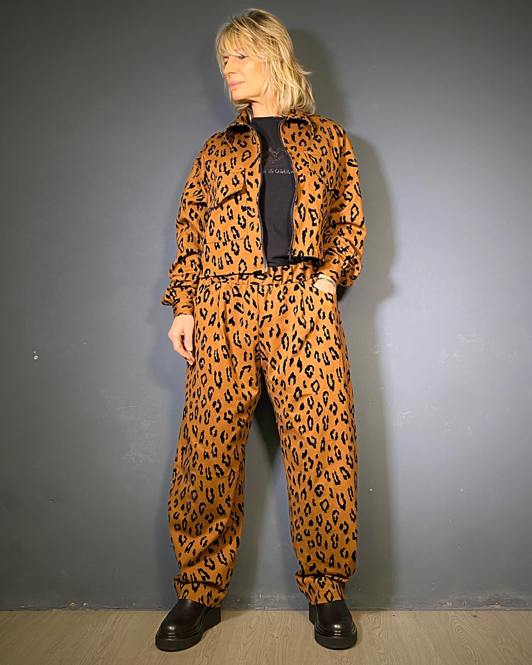 Il pantalone Emma lo adorerai! Best seller della collezione Effea, è comodo, morbido, da indossare in tutti i tuoi look più quotidiani! L'elastico in vita e le pieghe strategiche creano una vestibilità unica, adattandosi perfettamente al tuo corpo; la sua funzionalità insieme al design originale ed esclusivo fanno di Emma uno dei modelli più amati. Questa limited edition è realizzata in tessuto punto milano medio peso a fantasia animalier in velluto nero. La linea del pantalone è morbida sui fianchi e coscia, per restringersi armoniosamente sulla caviglia. La lunghezza è regolare e la taglia unica veste S/M/L. Contattaci con whatsapp al numero 3393511144 per qualsiasi domanda, e se volessi un Emma su misura, possiamo realizzarlo per te!