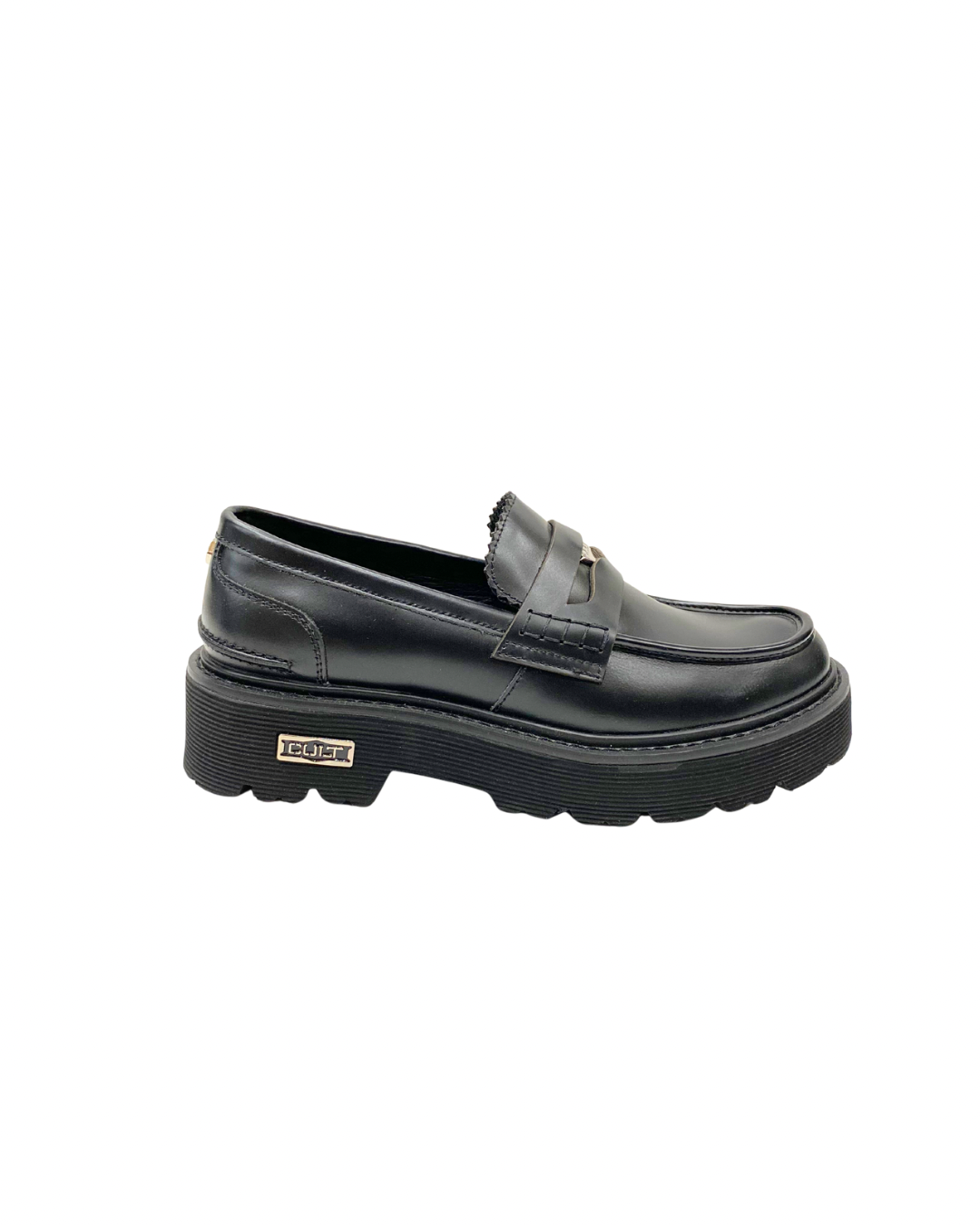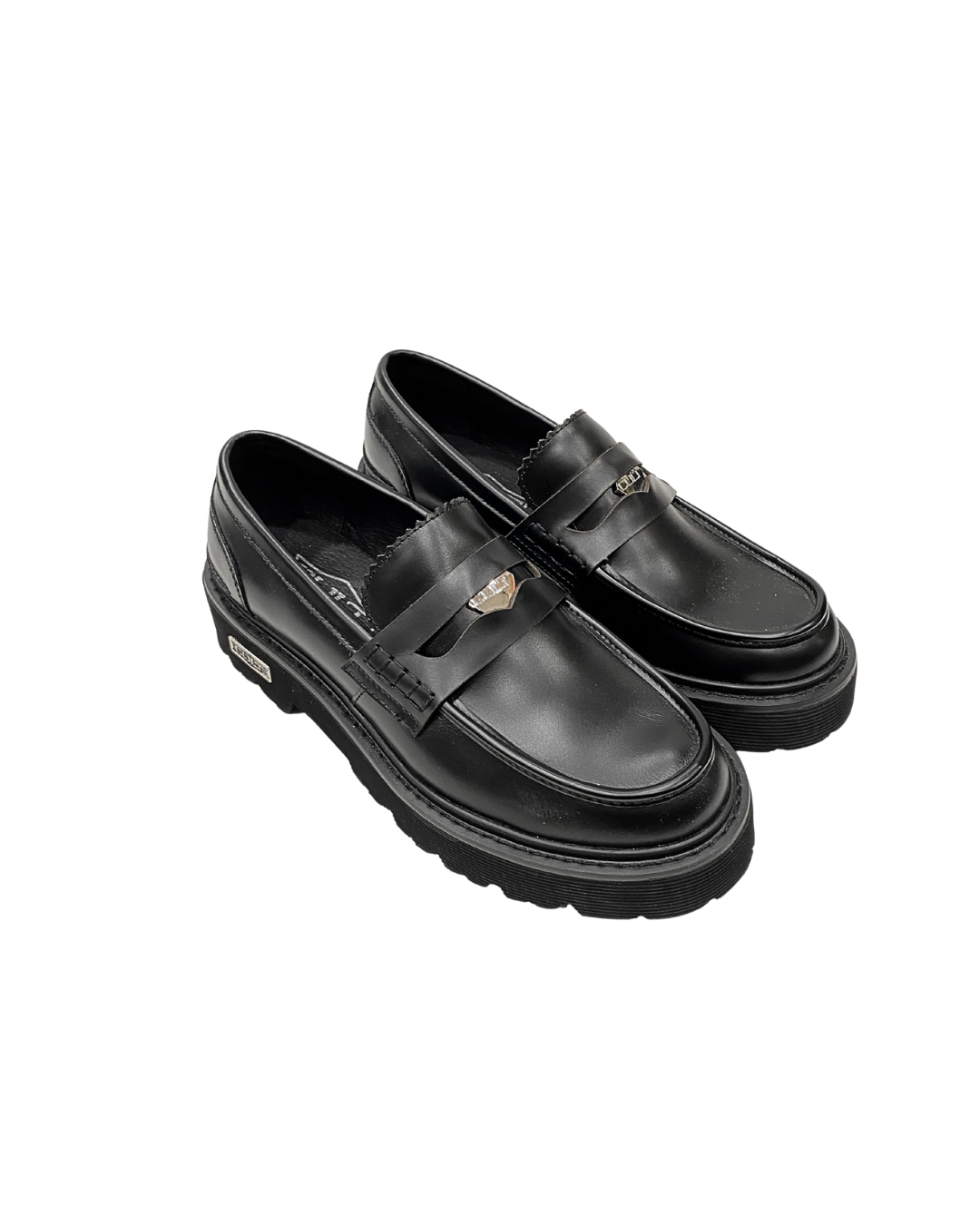 Intramontabili i mocassini della linea Slash firmati da Cult per questo inverno. In pelle spazzolata nera, questi mocassini con spessa suola in EVA, sono un must per la comodità e presentano l'iconica targhetta logata metallica. Da indossare sotto gonne o pantaloni per un look rock chic.